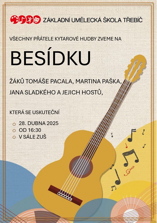 Koncertní sál ZUŠ. Masarykovo nám. Vystoupí žáci ze třídy Bc.Tomáše Pacala, Mgr. et Mgr. Martina Paška, Ph. D. a Jana Sladkého a hosté.