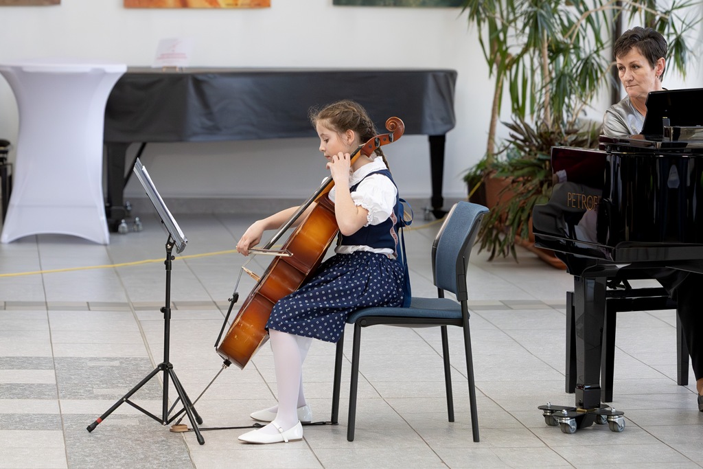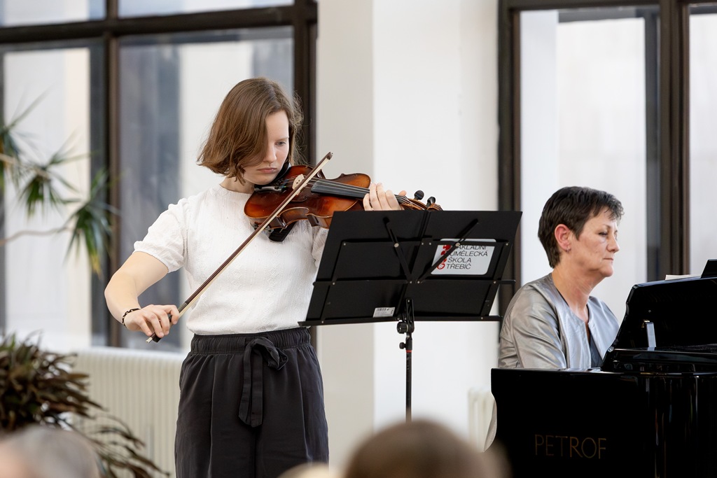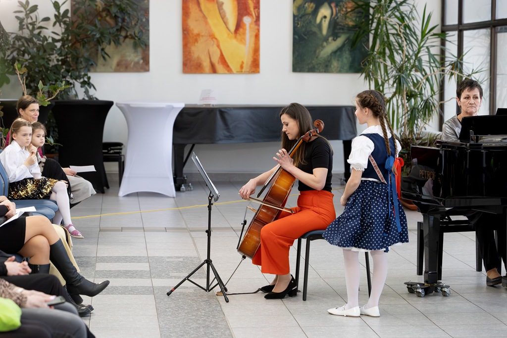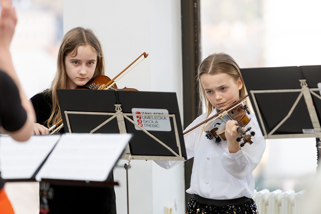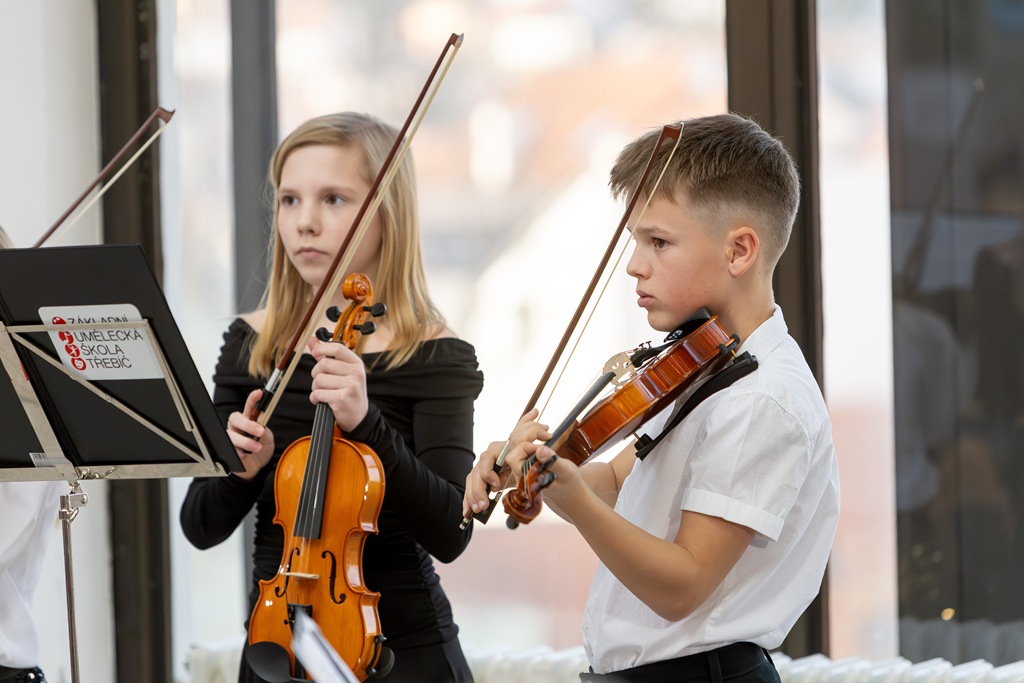 Třebíč. Divadlo Pasáž – foyer. Žáci a učitelé smyčcového oddělení. Organizace koncertu – Mgr. Vít Coufal.